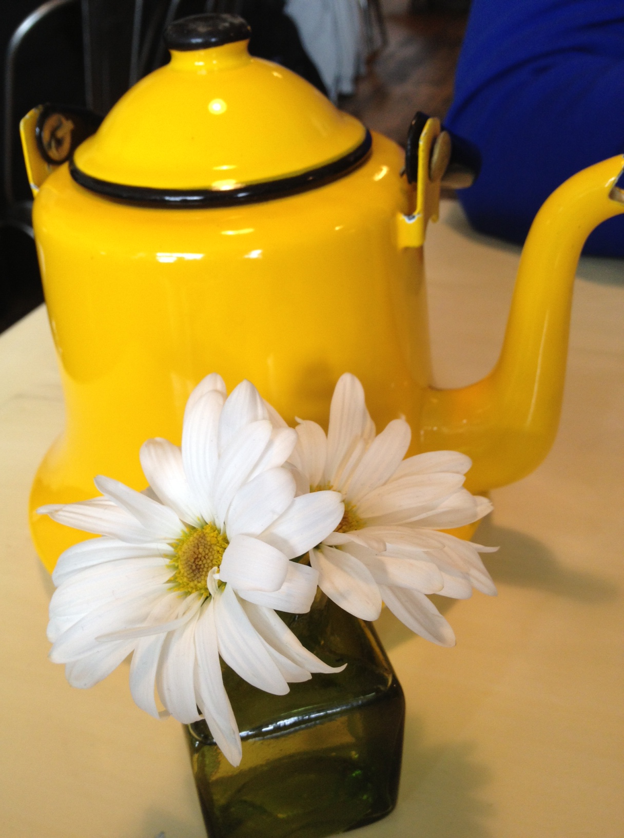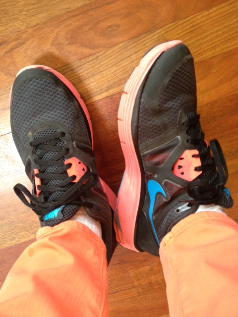 The teapot was a chamomile surprise at Oddfellows Cafe on Capitol Hill; along with the daisy arrangement it was a lovely added spot of color to the morning spent dining on a late breakfast with my two daughters. I intentionally bought these pants back in the fall and then found these brightly colored Nike’s at Sports Authority just before Christmas: put the 2 together and voila – instant flash of color 🙂