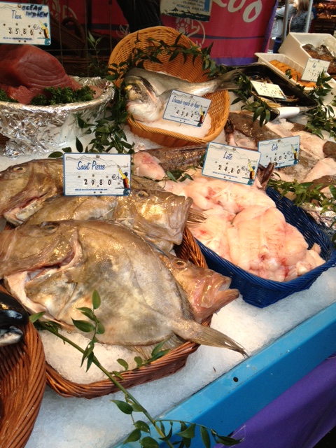 The sun meandered its way in and out of the clouds as we followed her through the market, stopping at various stalls. She would instruct us on what she noticed, why she was selecting each product and taught us some specifics on selecting fish, having decided as a group that we would like to learn to prepare a fish dish. She selected dos de cabillaud (back of the cod). I wish I could walk out my door each day and wander through markets like this.