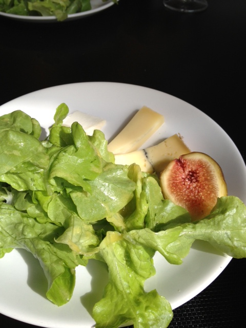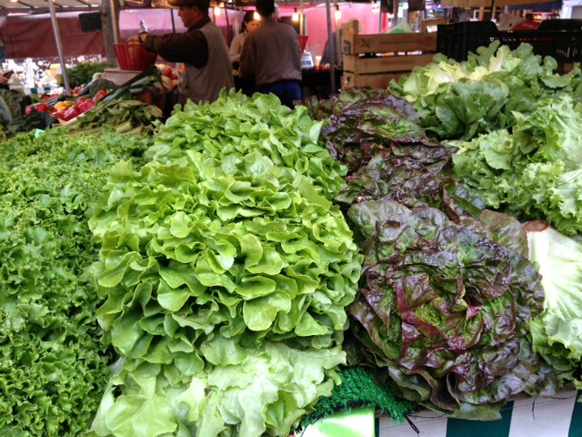 I wandered about taking photographs and listening as she engaged with the venders selecting: dos de cabillaud, 3 types of cheese, 2 types of bread from the boulangerie, fresh figs, peaches, cilantro, parsley, fingerling potatoes, red and yellow onions, shallots, garlic, zucchini, red and yellow peppers and the largest head of this magnificent type of lettuce that I still don’t know exactly what it was called.