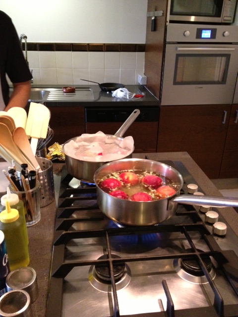 The kitchen is a rectangular shape with a long table and plenty of space for the 12 of us to work. Diane lead us through the menu for the day, where the equipment was etc and we got to work. We each had a plastic apron, knives, and a cutting board. I learned how to prepare: poached peaches, cashew brittle, pan sauteed and then quickly roasted dos de cabillaud ( seasoned with salt,pepper and fennel seeds), roasted fingerling potatoes with cloves of garlic, cumin, salt and pepper, roasted red and yellow peppers, sauteed zucchini, beurre blanc sauce (extreme yumminess of white wine, butter and shallots), charmolot (not sure of the spelling – a light fresh combination of parsley, preserved lemon, lemon rind, and parmesan – that you can top your fish with), roasted carrots that looked so beautiful because I learned how to keep some of the green top on them, and 2 kinds of french mustard dressing to lightly dress the gorgeous lettuce with. Phew!