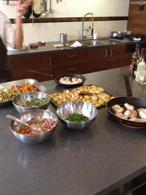 Along the way we helped carry the bags that Claire (la cuisine staff member) passed to us. She was personable, friendly and fun to chat with. We walked from the market, along Boulevard St. Germain, crossed the Seine just below Notre Dame via the bridges Pont St. Louis and Pont Louis Philippe and walked along Quai de l’Hotel de Ville where we entered the cooking school at #80. We were served coffee and tea as the chef took the ingredients upstairs to the kitchen.