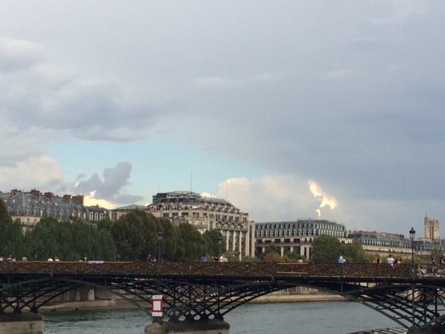 The Batobus arrived and I boarded along with multiple fellow travelers. Then the rain came down. Not a Seattle sprinkle or showering, but a full on thunder/lightning downpour. The windows on the sides of the Batobus were open as it had been so hot earlier in the day, and was still very muggy and humid. Funny thing about the Batobus, they can’t change the positions of the windows while on route – the next stop was 15 minutes along the Seine.