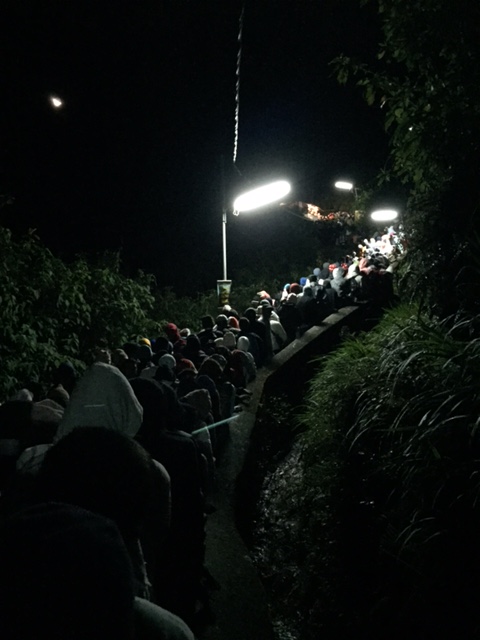 By 7:30 am we had not reached the top, and learned from fellow pilgrims that it would take at least another 2 hours to get there. We were at a complete, packed, body to body standstill. Concrete stairs, guard railings on both sides, 3 people wide (going up and down), no possible way to move. None. No movement. Quiet breathing, hundreds of people, patiently waiting.